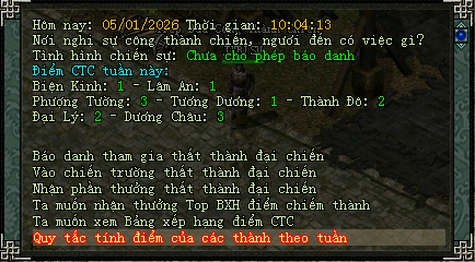 Địa điểm báo danh: NPC Tiếp Đầu Công Thành Chiến tại (Phía Đông - Thành Thị)