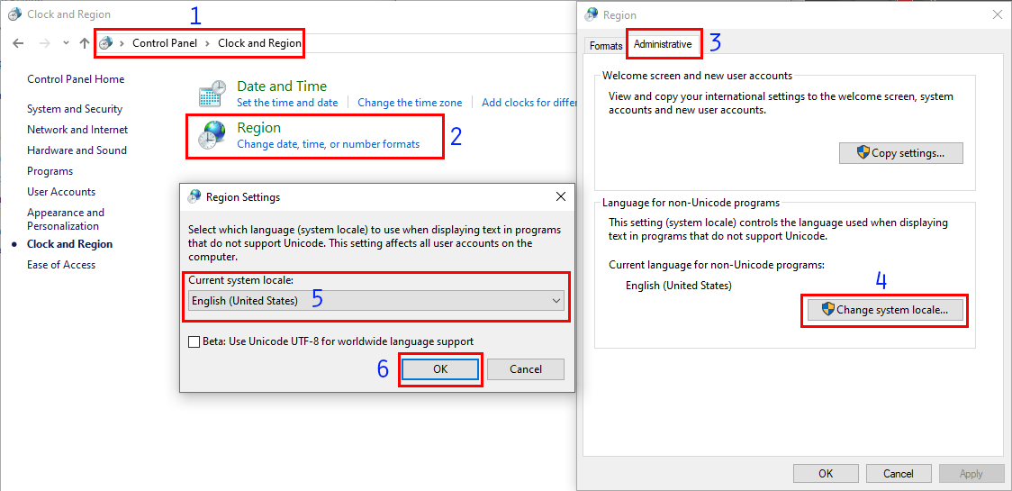 - Đầu tiên anh em bấm nút Windows trên bàn phím (4 ô vuông) sau đó bấm tìm Control Panel > Region > Administrative > Change system locale... ở phần Region Settings chỗ Current system locale: chọn English (United States) hoặc English (United Kingdom) và bấm OK rồi Reset máy xong cài lại file Vn.fon là Xong. AE có thể làm theo hình bên dưới.
