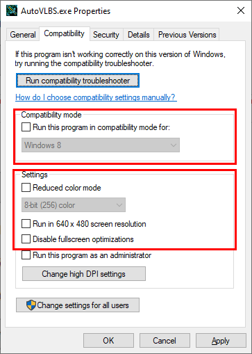- Đầu tiên vào thư mục chứa Auto chuột phải vào file AutoVLBS.exe chọn Properties > Compatibility ở cửa sổ Compatibility anh em nhìn theo hình dưới nếu có tick vào các ô như trong khung màu đỏ thì tắt hết đi và chọn Apply > OK. Nhớ là tắt cả bên Change settings for all users nữa nha.
